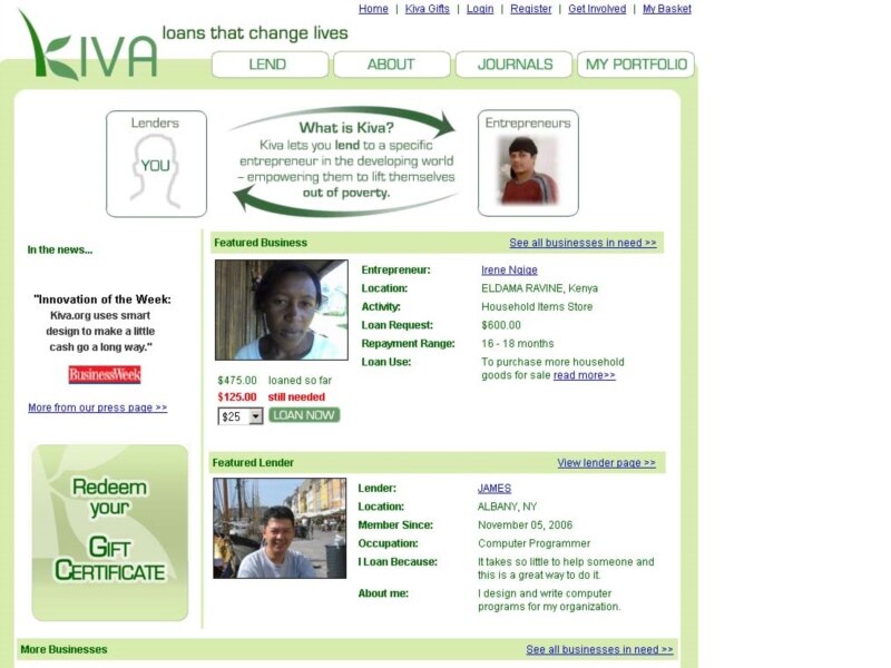 Kiva's slogan is "Loans that change lives," and in less than two years, visitors to its website have loaned more than $1 million to help start or expand more than 2,000 businesses.