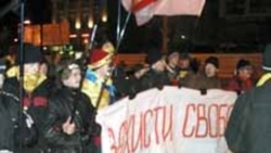 In Independence Square, the protesters waved blue-and-yellow Ukrainian and orange opposition flags and chanted "Yu-shchen-ko! Yu-shchen-ko!" The crackle of fireworks could be heard in the distance.