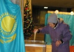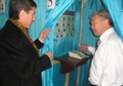 Opposition figure Bolat Abilov being instructed how to vote at an Almaty polling station