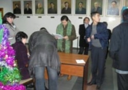 Workers at Almaty polling station No. 310 registering election monitors prior to the opening of voting on December 4