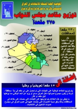 The Iraqi Independent Electoral Commission issued posters in Arabic and the two dialects of Kurdish on the allocation of National Assembly seats by governorate for the 15 December National Assembly election. The poster says, "230 seats for the governorates, as well as 45 compensatory and national seats," while the corresponding map shows the breakdown of seats by governorate.