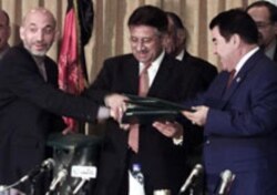 Niyazov (right) with Pakistani President Musharraf (center) and Afghan President Karzai meeting in 2002 (AFP)