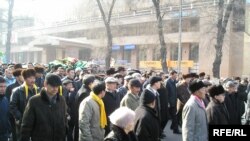Mourners march to the funeral of Altynbek Sarsenbaev, 15 February (RFE/RL) 28 February 2006 -- An unofficial commission monitoring the investigation into the killing of a Kazakh opposition leader said today it is "hard to believe" the murder was masterminded by a parliament official, and urged the authorities to widen the investigation.