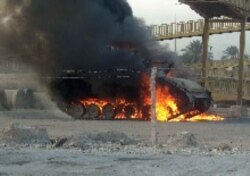 A U.S. military vehicle after being stuck by an explosive device in Baghdad in November 2005 (RFE/RL)