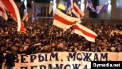 Protesters chanted "Freedom," "Motherland," "Long Live Belarus!" "We Shall Win!" and Milinkevich’s name. Others lit candles and waved flags adorning the traditional red and white colors of Belarus.