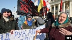 An elderly woman who supports President Lukashenka argues with members of the opposition, who continued to protest on the central square in Minsk on March 23 (epa) March 25, 2006 (RFE/RL)-- Despite an official ban, the liberal opposition in Belarus has urged supporters to rally in Minsk today to continue protests against what it calls the rigged reelection of President Alyaksandr Lukashenka, RFE/RL's Belarus Service reports.