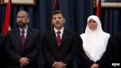 Minister of Finance Mohamed Abd Alrazeq (left), Deputy Palestinian Prime Minister Nasser Asaeer (center), and Minister of Women's Affairs Mream Salaeh (right) at the swearing-in ceremony for the new Hamas government in Ramallah today (epa) March 29 2006 -- Palestinian President Mahmud Abbas swore in a Hamas government today amid concerns the Palestinian administration was on the brink of financial collapse and faced Western isolation.