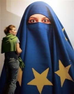 A poster by artist Burak Delier depicting a woman wearing a chador made from the European Union flag in an Istanbul exhibition in October 2005 (AFP)