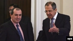 Russian Foreign Minister Sergei Lavrov (right) with Albanian Foreign Minister Besnik Mustafaj on April 12 (epa) April 12, 2006 -- Russian Foreign Minister Sergei Lavrov today said any haste in determining the status of Kosovo would be "useless and counterproductive."