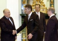 Yushchenko (center) with Russian Ambassador to Ukraine Viktor Chernomyrdin (left), Russian Foreign Minister Sergei Lavrov (rear), and Russian President Vladimir Putin (AFP file photo)