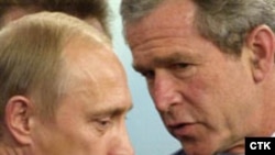 Russian President Vladimir Putin (left) and U.S. President George W. Bush (file photo) (CTK) May 8, 2006 -- U.S. President George W. Bush says Russia has been giving "mixed signals" about its commitment to democracy.