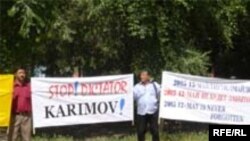 "We held a small action some 50 meters from the Kyrgyz-Uzbek border to mark the Andijon events," Kholdarov said. "We recalled last year's Andijon events and that no one should forget what happened, and we demanded an end to the dictator [Uzbek President Islam] Karimov. For about 25 minutes we held up banners. About 60 or 70 people were there and people came from the Kara-Suu bazaar to read our banners. About 60 or 70 people more gathered around us and those who came from Uzbekistan to the bazaar also read our banners."