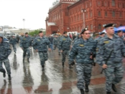 Riot police rushing to the scene of the wreath-laying near the Kremlin wall (RFE/RL)