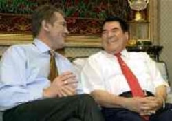 Turkmen President Saparmurat Niyazov (right) meeting with Ukrainian President Viktor Yushchenko in Ashgabat in March 2005