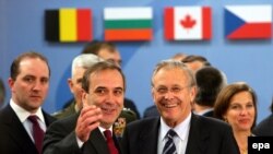 Spanish Defense Minister Jose Antonio Alonso (left) talks to U.S. Defense Secretary Donald Rumsfeld prior to today's meeting (epa) June 8, 2006 -- NATO is expressing determination to confront a surge in violence in Afghanistan and press ahead with the expansion of its mission there.