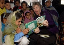 Hughes (right) reads a book with Kashmiri earthquake survivors during a visit to a tent school in Muzaffarabad on November 14, 2005 (official site)