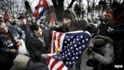Demonstrators burn U.S. flag in anti-Iraq war protest in Stockholm in March (epa) PRAGUE, June 14, 2006 (RFE/RL) -- According to a new survey of public opinion in 15 countries across the world by the Pew Research Center, the United States' image in the world is slipping, and many people think the U.S. presence in Iraq is a greater threat to world peace than Iran.