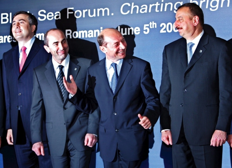 Kocharian (second from left) and Aliyev (right) with other leaders in Bucharest on June 5 (epa)