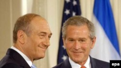 U.S. President George W. Bush (right) and Israeli Prime Minister Ehud Olmert, pictured in May (epa) July 22, 2006 -- In his weekly radio address today, President Bush said the way to end the conflict in Lebanon is to confront Hizballah and its backers, Syria and Iran. That, he said, would be the message U.S. Secretary of State Condoleezza Rice would take to the Middle East on July 23.
