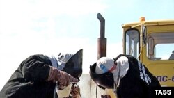 Welders at work on a new oil pipeline in eastern Siberia (file photo) (ITAR-TASS) July 31, 2006 -- There are conflicting reports today about possible damage from an oil pipeline leak in western Russia.