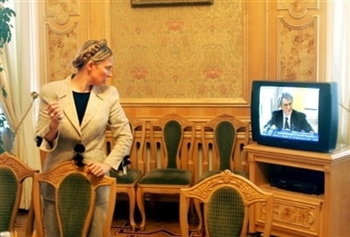 Yuliya Tymoshenko watches as Yushchenko announces on national television that he is firing her as prime minister on September 8, 2005 (AFP)
