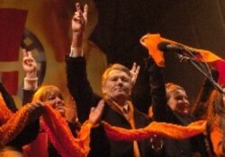 Yushchenko (center) with Tymoshenko (right) at an Orange Revolution demonstration in December 2005 (epa)
