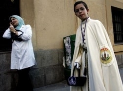 A Muslim woman (left) watches a Christian procession in Madrid in March (AFP)
