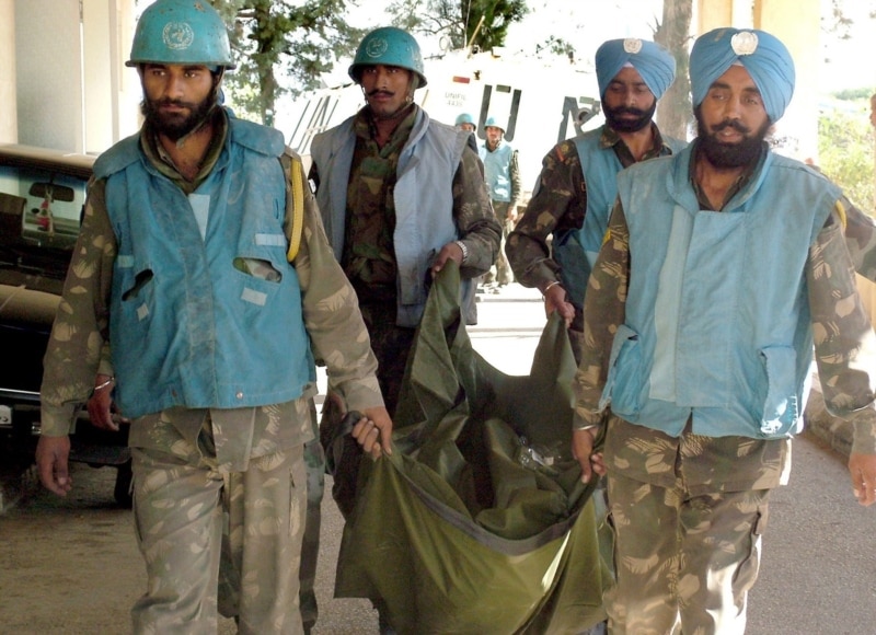 UN observers remove the body of a comrade who was killed in an Israeli air strike in southern Lebanon on July 25 (epa)