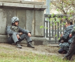 Special forces troops wait as some 900 people are held hostage in a Moscow theater on October 22, 2002 (TASS)