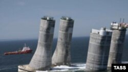 The base of an oil-and-gas platform being pulled into position off Sakhalin in July 2005 (ITAR-TASS) PRAGUE, September 18, 2006 (RFE/RL) -- The Russian Natural Resources Ministry today announced that it has revoked environmental approval for a Shell-led liquefied natural gas project on the island of Sakhalin, in the Russian Far East.