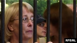 A police officer closes the gate on a Minsk detention center after demonstrators were brought there on March 24, 2006 (RFE/RL)