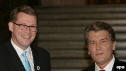 Viktor Yushchenko (right) with Finnish Prime Minister Matti Vanhanen in Helsinki today (epa) October 27, 2006 -- Ukrainian President Viktor Yushchenko is holding talks in Helsinki today with European leaders in a bid to improve his country's prospects of eventual EU membership.