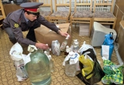 A police officer inspects a haul of bootleg vodka confiscated in Belgorod Oblast last month (ITAR-TASS)