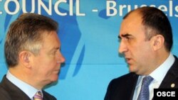 Mammadyarov (right) with OSCE head Karel De Gucht in Brussel on December 4 (OSCE) December 5, 2006 -- Azerbaijani Foreign Minister Elmar Mammadyarov says a number of sticking points remain for the conflict over Nagorno-Karabakh to be resolved.