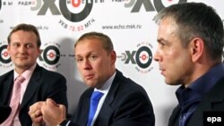 Trepashkin (left) at a November 1998 Moscow press conference at which Litvinenko (right) claimed he had been ordered to kill Boris Berezovsky ((AFP)