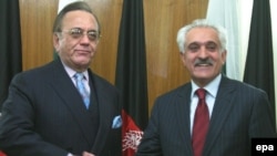 Pakistani Foreign Minister Kasuri (left) will meet with his Afghan counterpart, Rangin Dadfar Spanta, today (epa) December 8, 2006 -- Afghan President Hamid Karzai has told visiting Pakistani Foreign Minister Khurshid Kasuri that Afghan public patience is "wearing thin" amid increased violence that Kabul blames on Pakistani-based insurgents.
