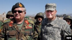 Outgoing commander Eikenberry (right) and his Afghan counterpart (file photo) (epa) December 30, 2006 -- The outgoing U.S. commander in Afghanistan expects higher levels of fighting in the coming year.