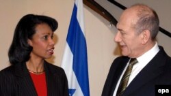 Secretary Rice (left) with Israeli Prime Minister Ehud Olmert today (epa) January 15, 2007 (RFE/RL) -- U.S. Secretary of State Condoleezza Rice was back in Jerusalem today for talks with Prime Minister Ehud Olmert after visiting the West Bank and Jordan yesterday.