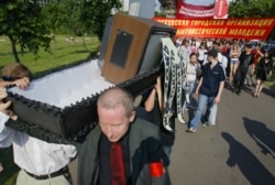 Demonstrators in Moscow carry a coffin with a television in it to protest government control over broadcasting (TASS file photo)