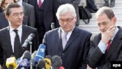 Douste-Blazy (left) with Solana (right) and their German counterpart, Frank-Walter Steinmeier (file photo) (epa) February 12, 2007 -- Foreign ministers of the 27 European Union member countries meeting in Brussels have approved plans for implementing UN sanctions against Iran.