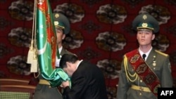 Berdymukhammedov kissing the flag during his inauguration (AFP) February 14, 2007 (RFE/RL) -- Turkmenistan has a new leader. As expected, former Health Minister Gurbanguly Berdymukhammedov has become the second president in Turkmenistan's post-Soviet history.
