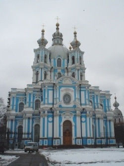 The Gazprom site today stands behind a giant billboard reading "Gazprom City." On the opposite side of the Neva, university students on the grounds of the majestic blue-and-gold Smolny Cathedral were of two minds about the construction.
