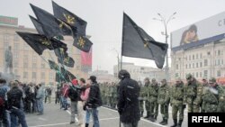 They held banners and speakers at the rally called for Russia to expand its clout in the former Soviet lands.