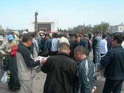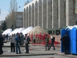 On Alatoo Square, a crowd, estimated to number more than 10,000 people, held up banners reading "Reforms Without Bakiev," as leaders of the United Front gave speeches. About 100 yurts and tents have been set up to accommodate those planning to stay overnight.