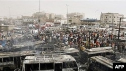 Site of bombing in Baghdad's Al-Sadriya district on April 18 (AFP) April 19, 2007 (RFE/RL) -- Nearly 200 people have been killed in a series of attacks in Baghdad in the worst single day of violence in the Iraqi capital since the U.S.-led security crackdown began in February.