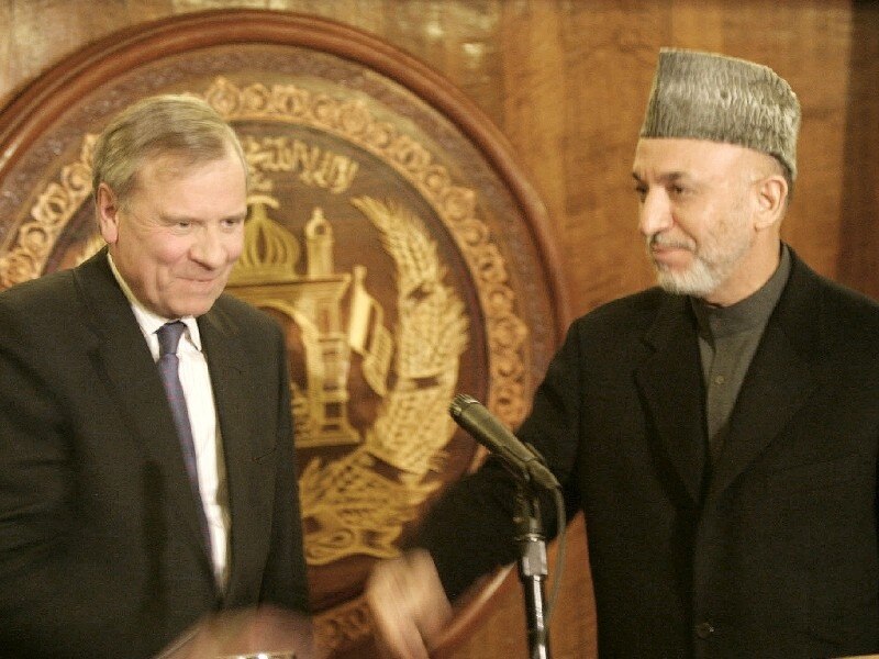 Jaap de Hoop Scheffer (left) with President Hamid Karzai on a February, 2007, visit to Afghanistan (epa)