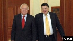 Tazhin (right) with OSCE Chairman in Office Miguel Angel Moratinos in Astana (file photo) (OSCE) May 10, 2007 -- Kazakhstan's foreign minister says U.S. Secretary of State Condoleezza Rice raised concerns about political reform in the country during a meeting in Washington.