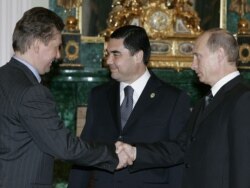 Putin (right) meets with Turkmen President Berdymukhammedov (center) and Gazprom CEO Aleksei Miller in the Kremlin in April (TASS)
