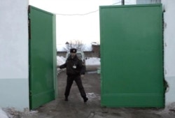 A police officer closes the gate on a Minsk detention center after demonstrators were brought there on March 24, 2006 (RFE/RL)