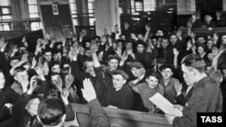 Factory workers in 1937 vote in favor of the arrest of "Trotskyite spies" (ITAR-TASS) June 21, 2007 (RFE/RL) -- Russian President Vladimir Putin has warned the world against trying to make Russia feel guilty about the Great Purge, one of Soviet history's most painful episodes.